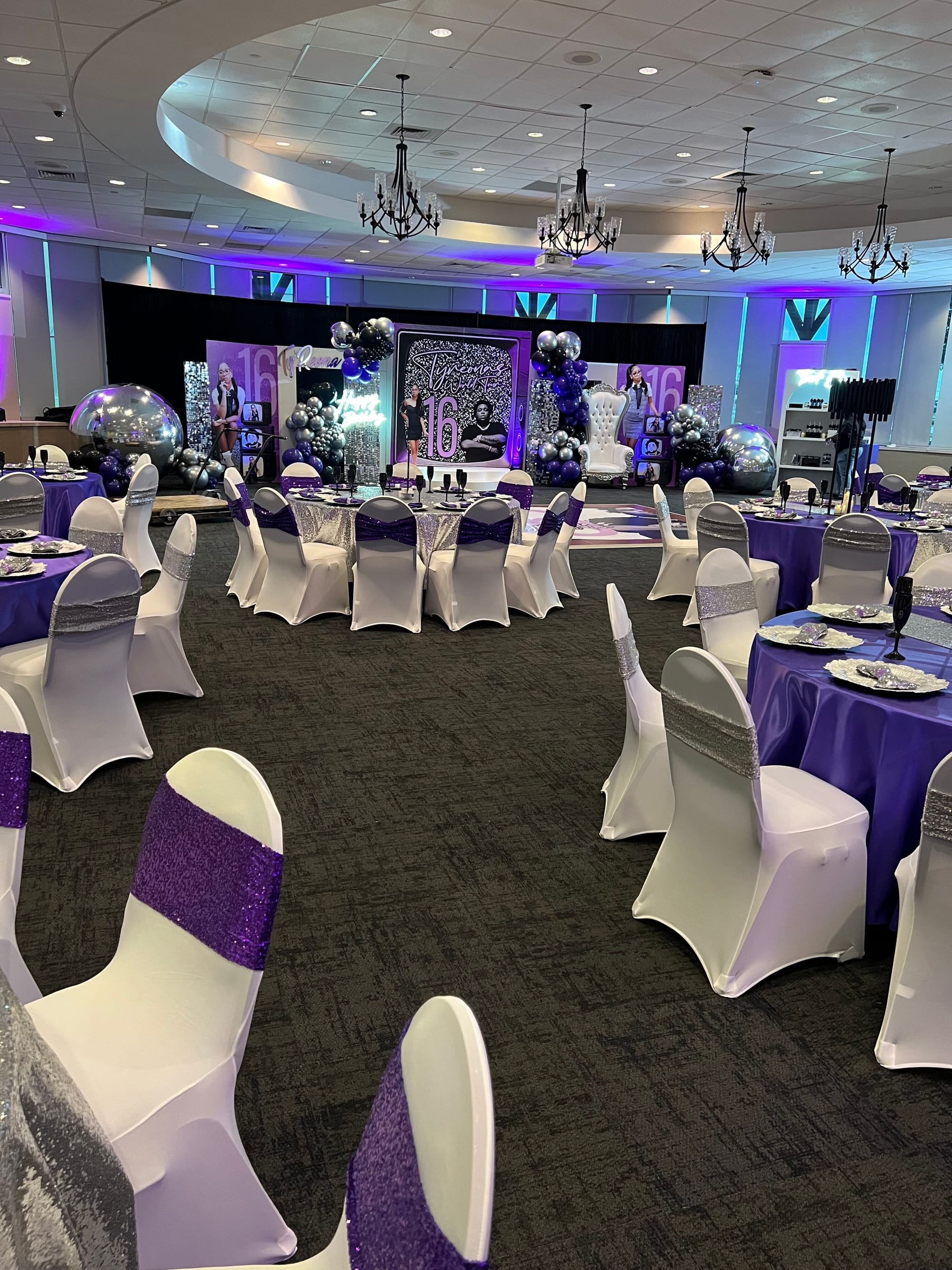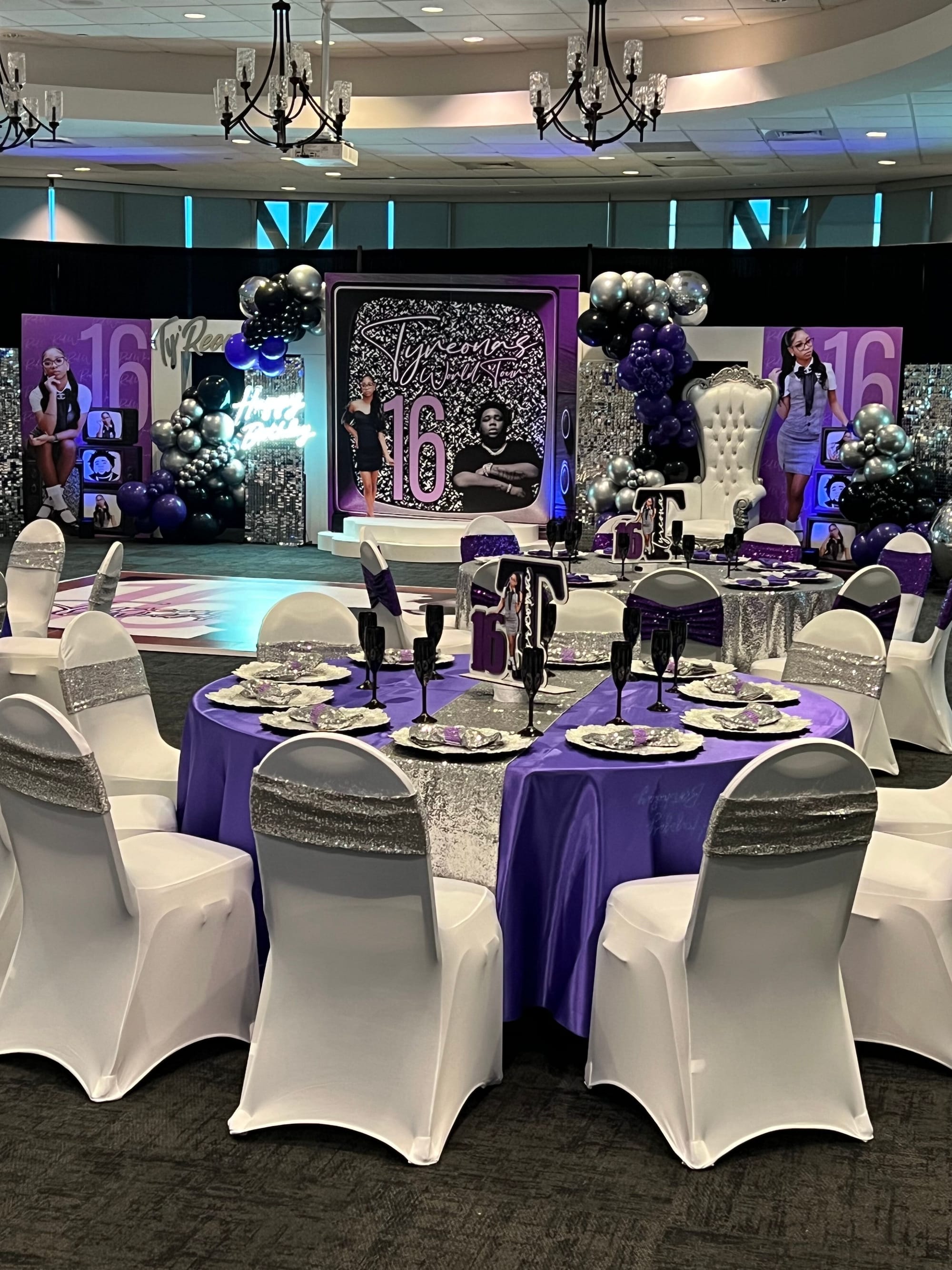Any character theme, Organic balloon garlands plus 3backdrops, marquee number, table decor: chair covers, sashes,table cloths, chargers, centerpieces, napkins